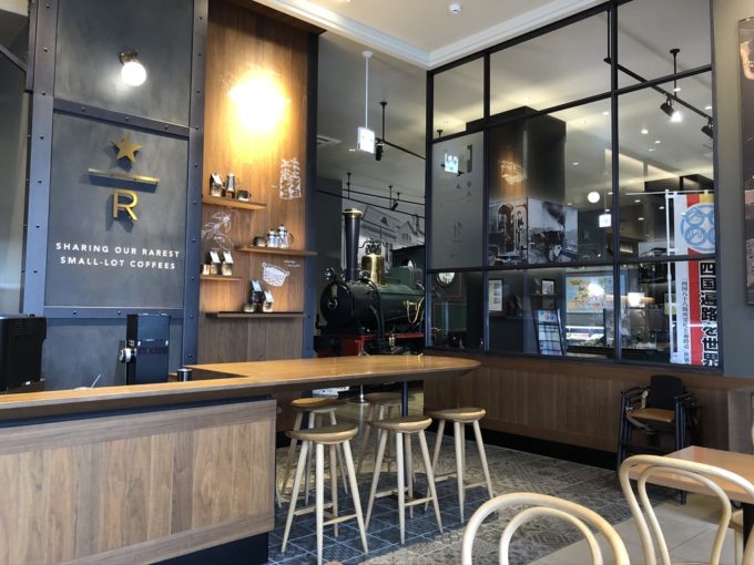 松山市駅から近くのスタバはインスタ映えして居心地もいい。坊っちゃん列車ミュージアムに隣接していて、坊っちゃん列車を眺めながらコーヒーを飲むことができる。席も全体的に広々としていて居心地がいい。リザーブ対応なので、リザーブのコーヒーも飲むことができる。