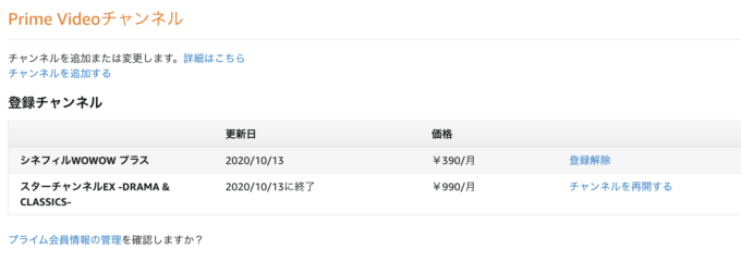 確認ボタンを押して解約すると、下のスターチャンネルEXのところみたいに、「チャンネルを再開する」というような表示になります。
