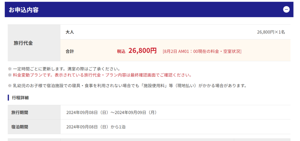 日本旅行はパンフレットがなかったため予約ページを進めて確認しましたが、1枚目とほぼ同じでした。
