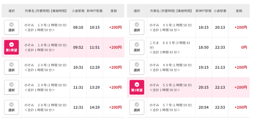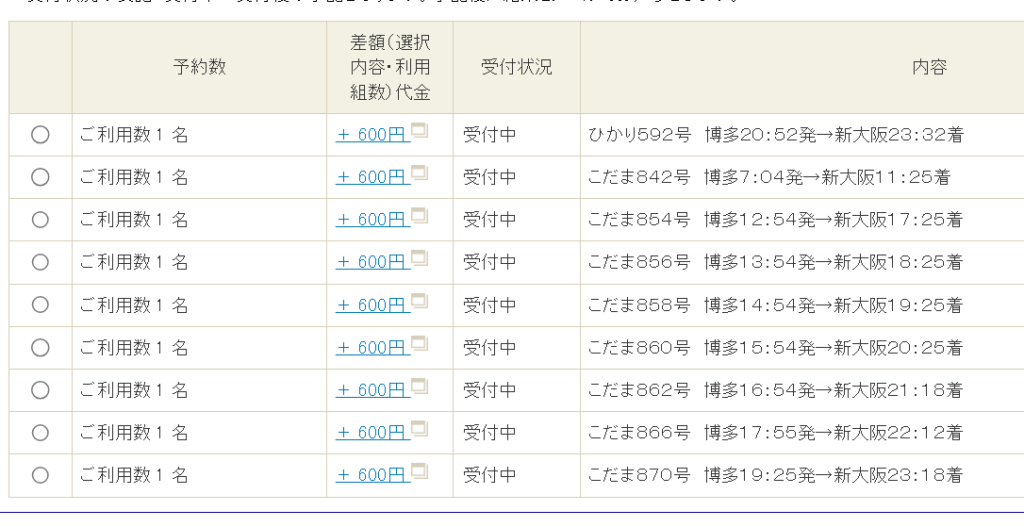 このプランでは、利用可能な列車と時間帯が限られていますが、プランによって少し違いました。